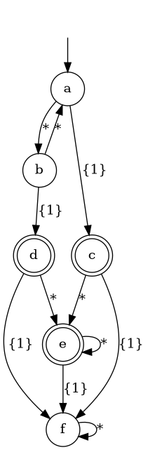 >>> Just a = dfa [ ("a",[('1',"c")],"b"), ("b",[('1',"d")],"a"), ("c",[('1',"f")],"e"), ("d",[('1',"f")],"e"), ("e",[('1',"f")],"e"), ("f",[],"f") ] "a" ["c","d","e"]