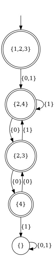 >>> saveDotAsPng "dfa.png" $ dfaToDotWithTokens "01" $ nfaToDfa a